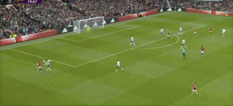 第43分钟,曼联反击,B费左路内切,禁区外右脚远射打偏。